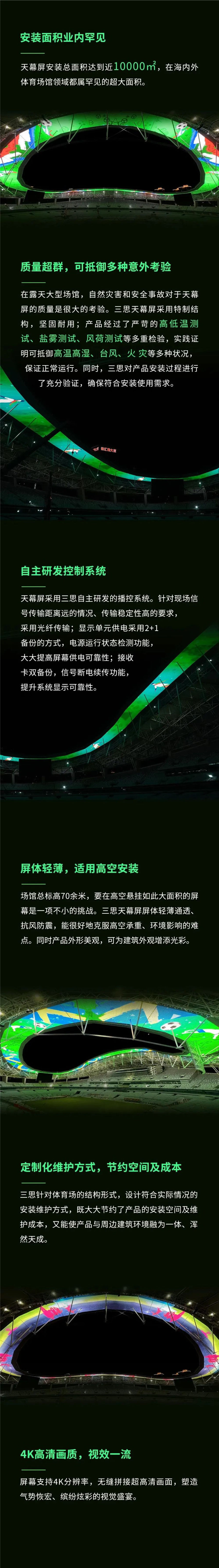 此次三思為上海體育場打造的10000㎡天幕屏,可謂“巨無霸”級別。巨大的屏體沿建筑輪廓而設計,每至夜幕降臨、屏幕亮起,其宛若一條騰躍起舞的蛟龍,在場館上空游走,與深邃天空相輝映,與綠茵草地同閃耀。