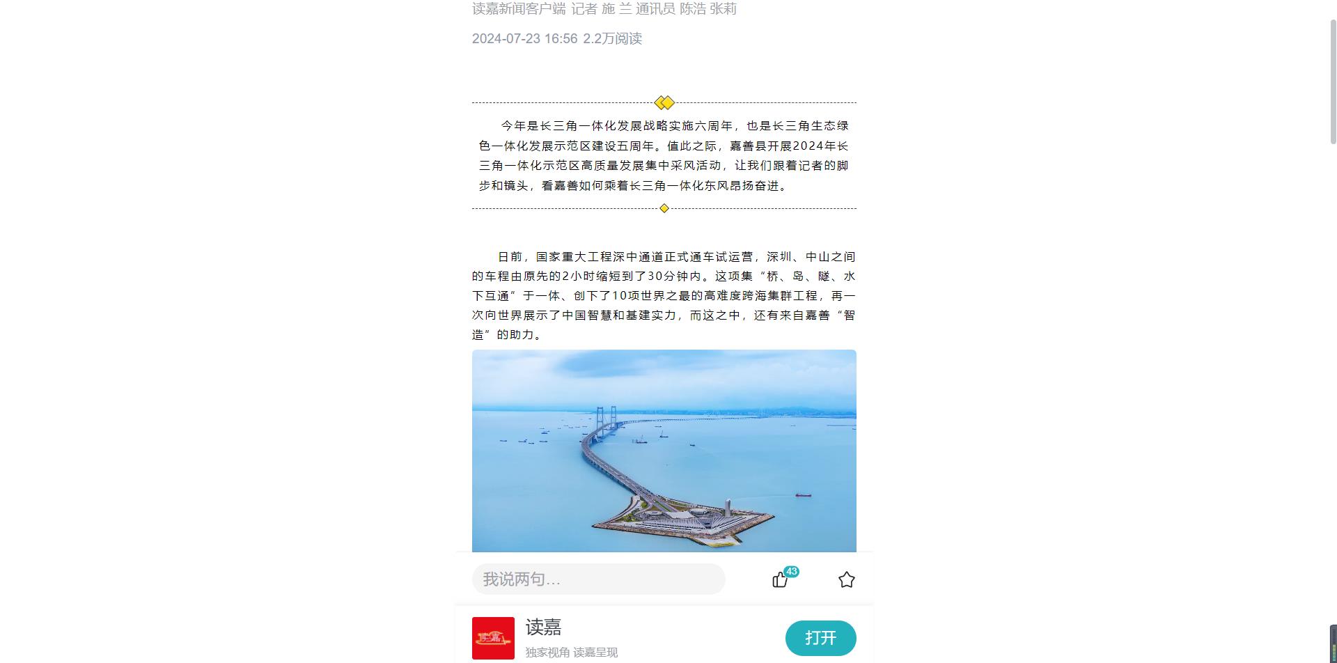今年是長三角一體化發(fā)展戰(zhàn)略實(shí)施六周年,也是長三角生態(tài)綠色一體化發(fā)展示范區(qū)建設(shè)五周年。值此之際,嘉善縣開展2024年長三角一體化示范區(qū)高質(zhì)量發(fā)展集中采風(fēng)活動(dòng),讓我們跟著記者的腳步和鏡頭,看嘉善如何乘著長三角一體化東風(fēng)昂揚(yáng)奮進(jìn)。