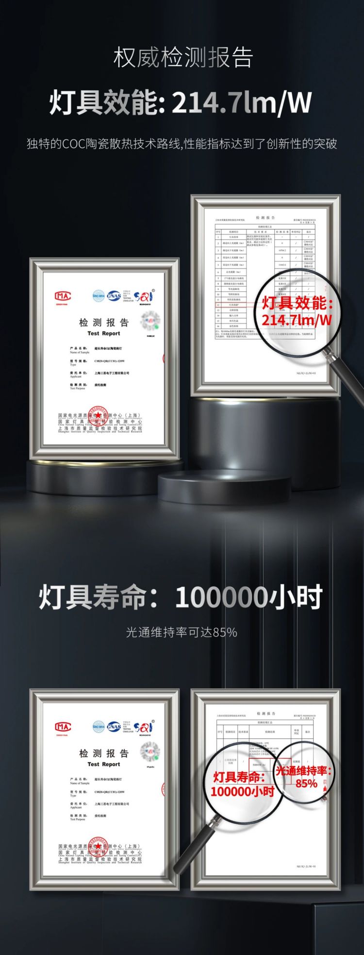 使產(chǎn)品的系統(tǒng)光效顯著提升至214.7 lm/W,10萬小時光通維持率不低于85%!三思超長壽命COC陶瓷路燈的綜合性能指標(biāo)優(yōu)勢顯著,為全球節(jié)能減排提供新的“利器”。