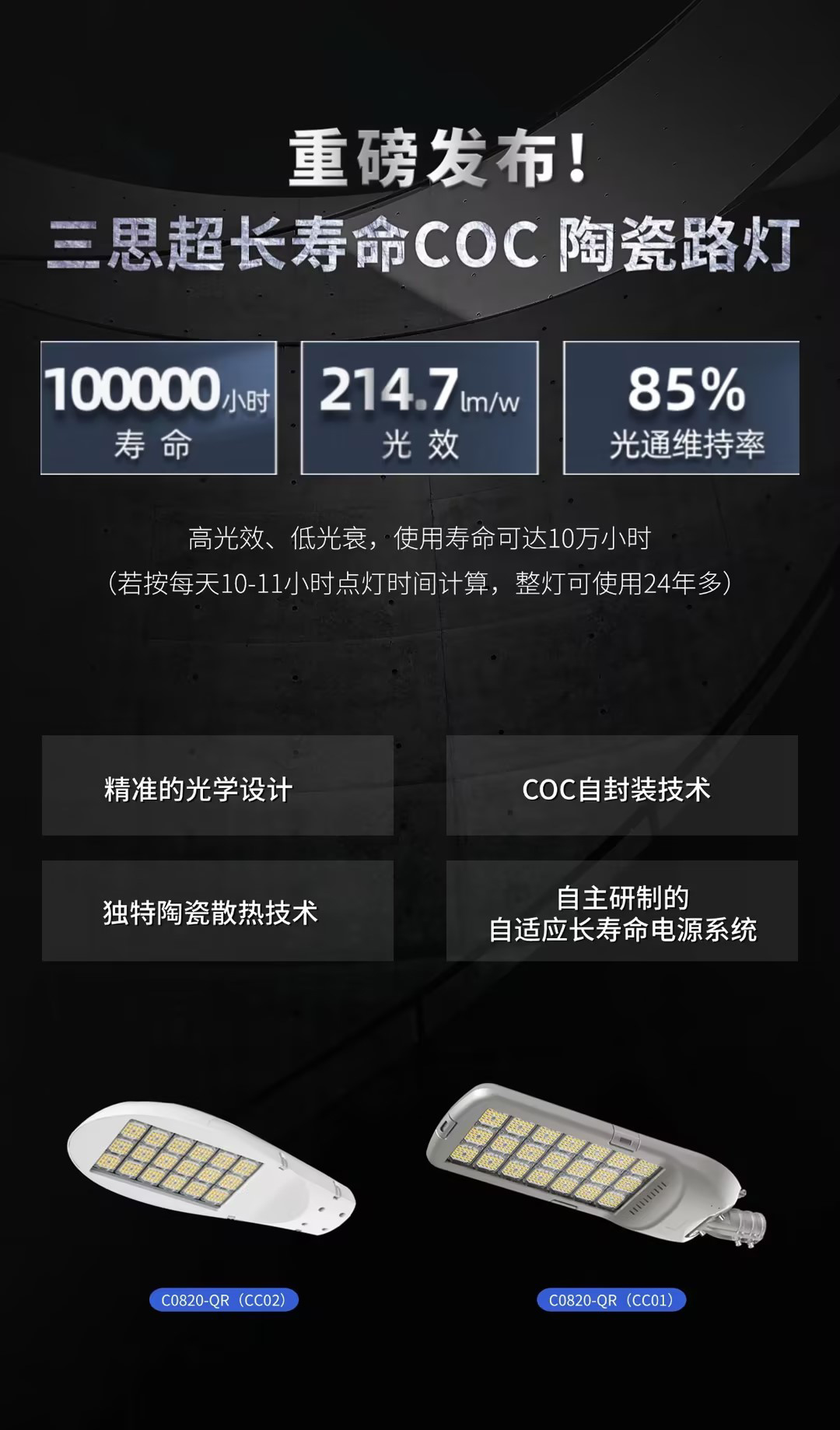 上海三思正式發(fā)布兩款超長壽命COC陶瓷路燈C0820-QR(CC01)和C0820-QR(CC02)系列。