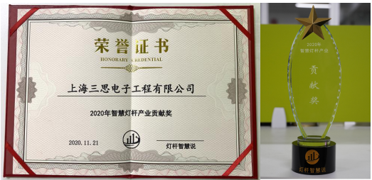 在頒獎(jiǎng)儀式上,上海三思獲“2020智慧燈桿產(chǎn)業(yè)貢獻(xiàn)獎(jiǎng)”,該獎(jiǎng)項(xiàng)是對(duì)深耕智慧路燈行業(yè)多年企業(yè)的肯定和鼓舞,對(duì)上海三思為智慧燈桿產(chǎn)業(yè)發(fā)展做出積極貢獻(xiàn)的褒獎(jiǎng)。