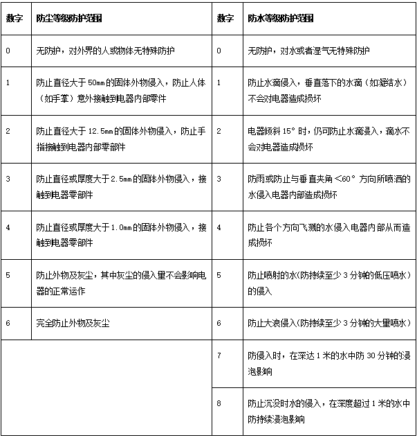 下面表格,簡要標(biāo)明了IP防護(hù)等級(jí)標(biāo)準(zhǔn)。