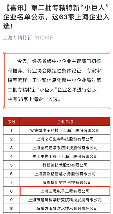 去年11月13日,上海三思還入選工業(yè)和信息化部辦公廳“第二批專精特新小巨人企業(yè)培育”名單,進(jìn)一步推動(dòng)企業(yè)高質(zhì)量發(fā)展,提高企業(yè)專業(yè)化能力和水平。