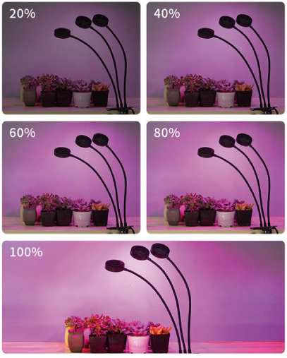 它在不同亮度模式下,所釋放的光子數(shù)目不同,當(dāng)亮度增大時(shí)也就意味著光子數(shù)目會增多。您可以通過選擇20%、40%、60%、80%、100%不同亮度,為家里的小番茄、多肉補(bǔ)充光照。