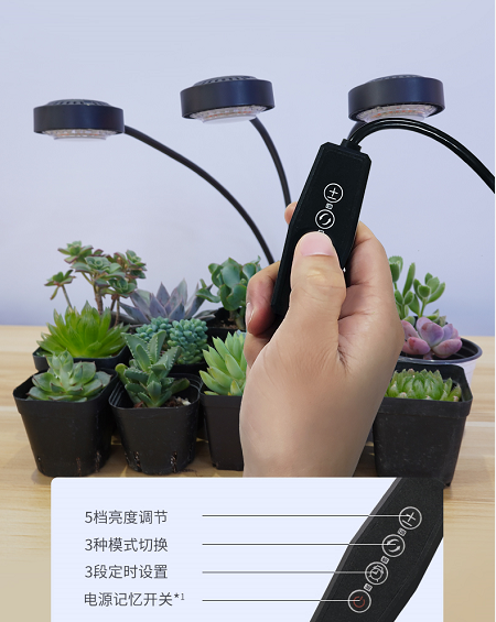 通過線上控制器,燈亮狀態(tài)下,短按分別開啟 3/6/12 小時(shí)倒計(jì)時(shí),當(dāng)?shù)褂?jì)時(shí)結(jié)束后,燈具將自動關(guān)閉,出門忘記關(guān)燈再也不怕不怕了;不管家里種的是喜陽植物,還是喜陰植物,通過5檔亮度調(diào)節(jié),可以選擇合適光照;通過3種模式靈活切換,植物苗期、生長期、開花期、結(jié)果期不同光照需求,一盞燈就可以輕松搞定;想要打開之后的燈保持關(guān)閉前的亮燈狀態(tài),通過電源記憶開關(guān)就可以實(shí)現(xiàn)啦,同時(shí)每按電源記憶開關(guān)一次即可關(guān)閉一個(gè)燈,按鍵3次后,3個(gè)燈全部關(guān)閉。