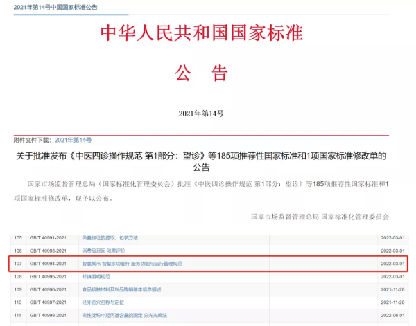 《智慧城市 智慧多功能桿 服務(wù)功能與運(yùn)行管理規(guī)范》國家級標(biāo)準(zhǔn)于2021年11月26日發(fā)布,并于2022年3月1日起正式實(shí)施。