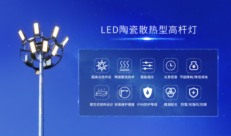 安裝于重點(diǎn)運(yùn)動(dòng)會體育場館外及生活廣場的LED高桿燈是一種實(shí)用性強(qiáng)、性價(jià)比高的照明產(chǎn)品。不僅照明功能強(qiáng)大,作為燈飾也能美化環(huán)境,讓夜間出行有生活保障。
