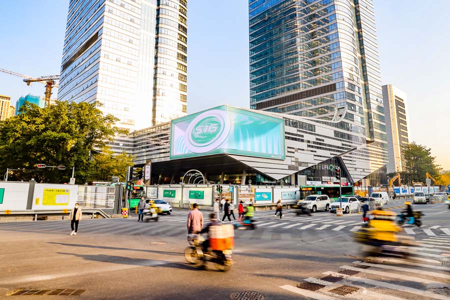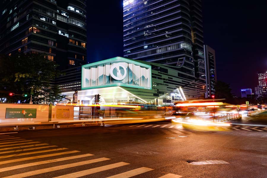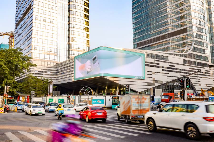 在這條“硅谷大道”的裙樓之上,新落成了一塊由上海三思承建的606㎡戶外裸眼3D大屏。這片覆蓋上市公司多達(dá)110余家、總市值為4.25萬(wàn)億元、占南山區(qū)上市公司總市值70.83%的科技園區(qū),又新添了一處“流量密碼”。