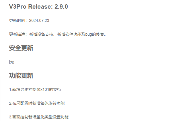 查看詳細 >>V3Pro Release: 2.9.0更新時間:2024.07.23更新描述:新增設備支持、新增軟件功能及bug的修復。
