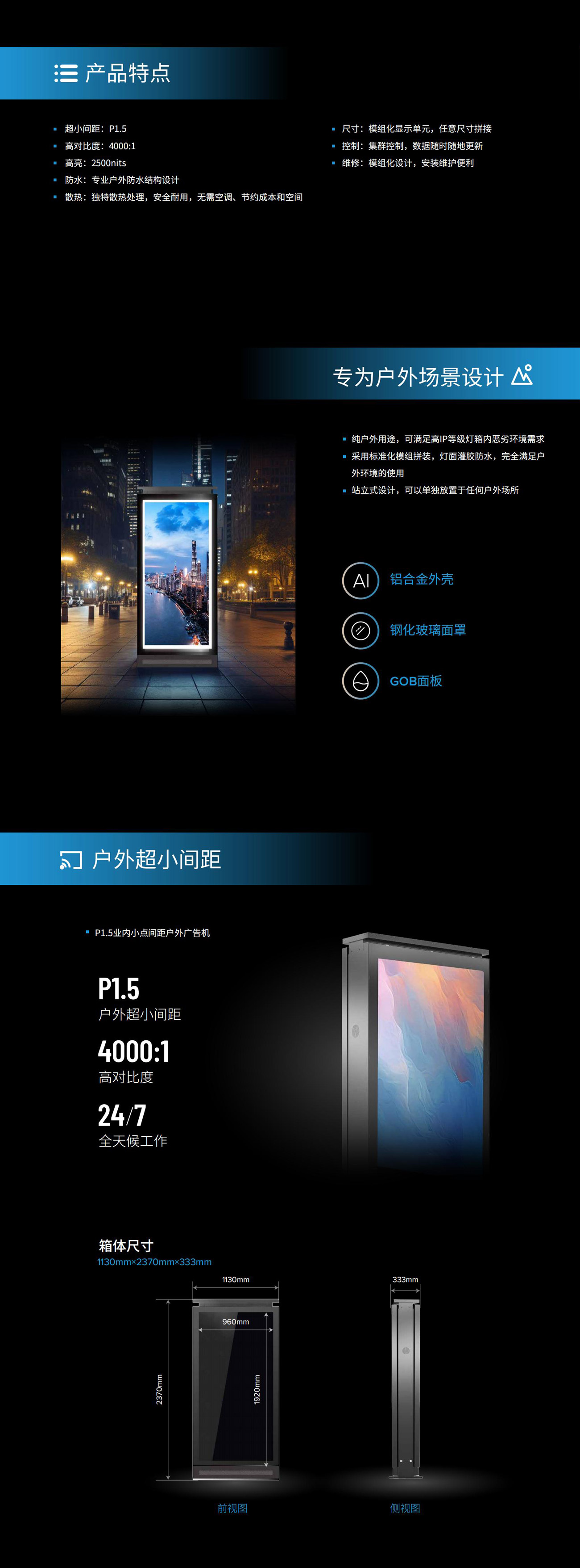 在各類公共場(chǎng)合中,相較傳統(tǒng)廣告牌的靜態(tài)傳播方式,實(shí)時(shí)傳輸?shù)膭?dòng)態(tài)傳播、高質(zhì)量的內(nèi)容傳遞以及受眾互動(dòng)模式,更能滿足人們對(duì)戶外廣告的需求。三思戶外廣告機(jī)不僅滿足上述條件,它也是一款從細(xì)膩的畫質(zhì)、流暢的刷新率,到高對(duì)比度,都能讓你大開眼界的小間距戶外廣告機(jī)。強(qiáng)大的防護(hù)性能,更能適應(yīng)戶外惡劣的工作環(huán)境。